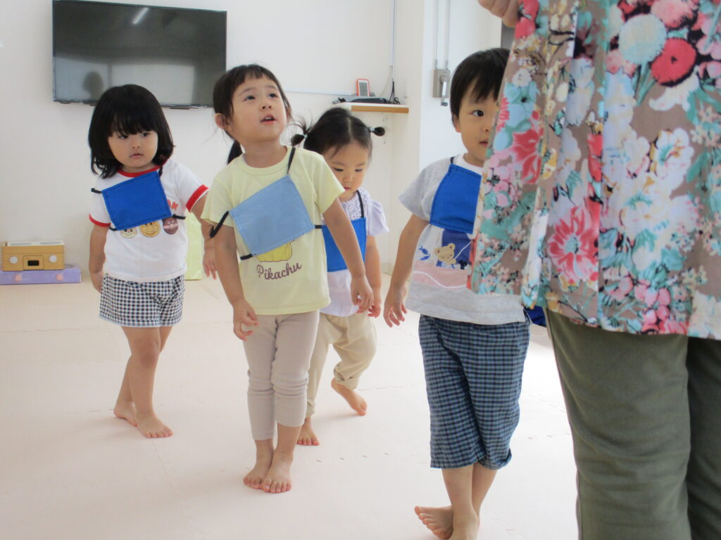 「〇〇ちゃん、出来るよ!」と張り切って参加する姿がなんともたのもしい にじ🌈組さんなのでした。(^^♪