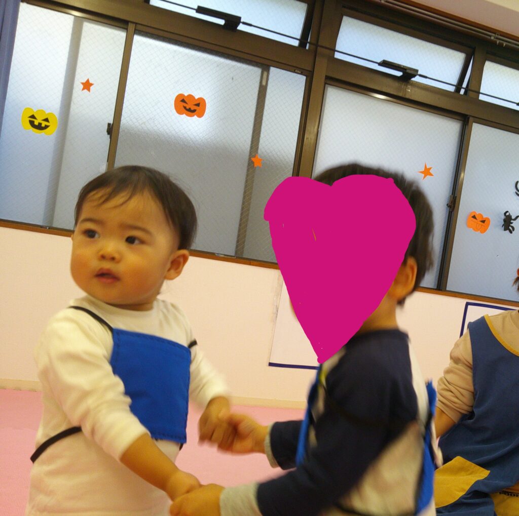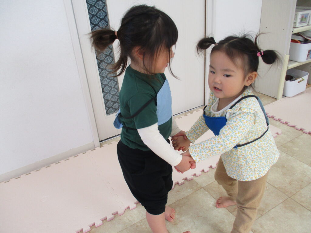 ニコニコお顔で参加する そら組さん。 先生と手をつないでリトミックをしていた姿から、お友だちと手をつないでリトミックをする姿へと、大きく成長しています。🎵