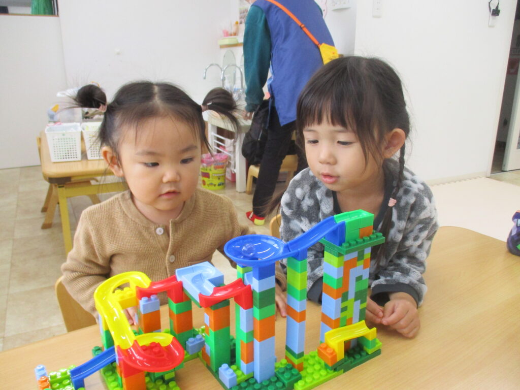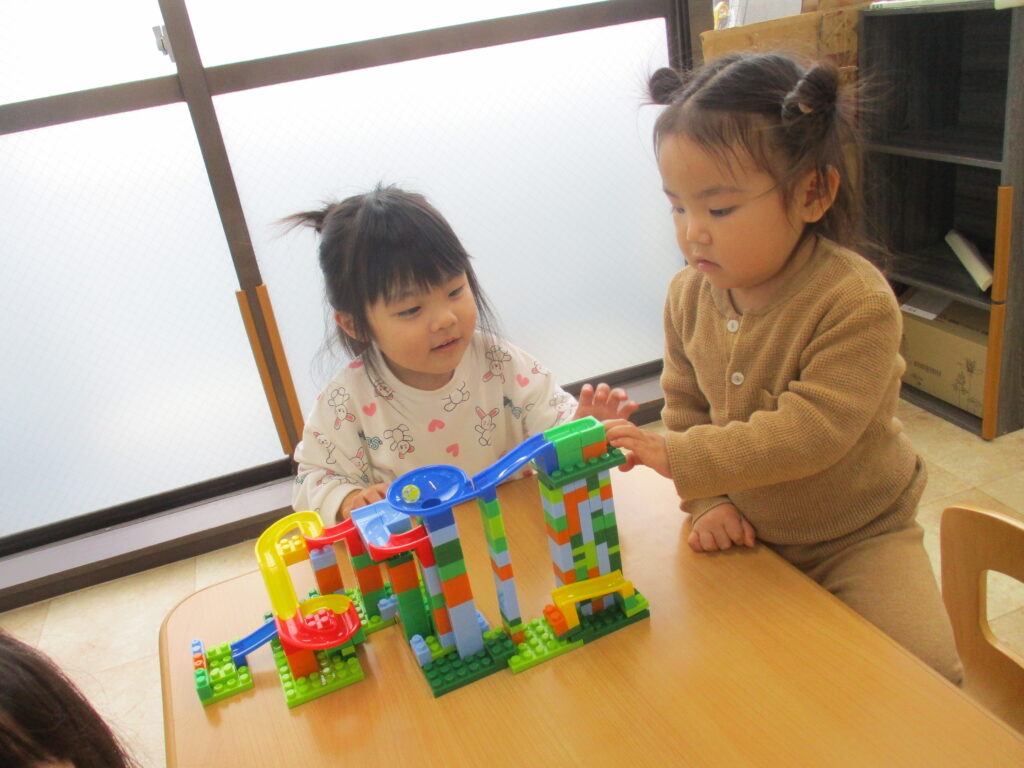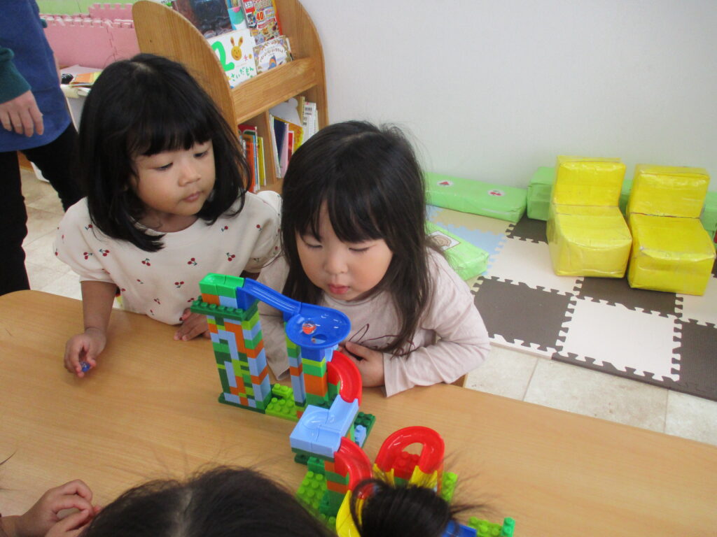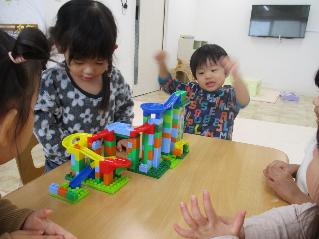 楽しんでいます。💓 にじ🌈組さんは新しいおもちゃに夢中。👍 組み立てたブロックの中をビー玉が転がって行く様子を飽きる事なく見ています。