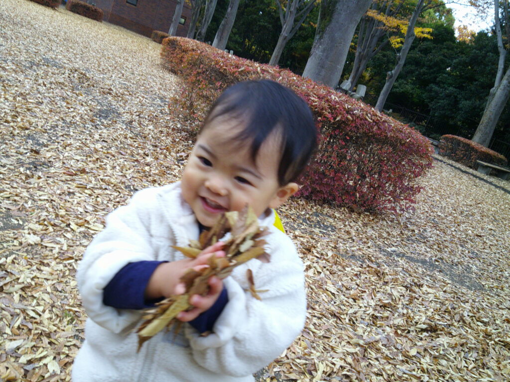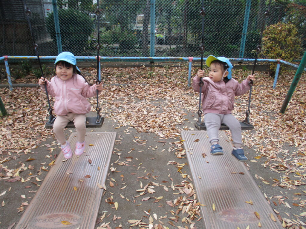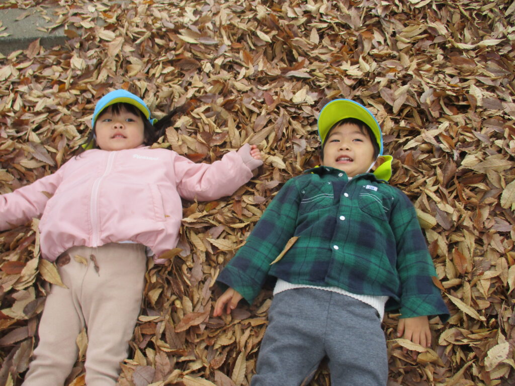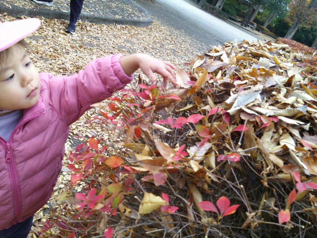 枯葉を踏んだり、触ったりして秋から冬へと移り行く自然を感じているそら組さんと、おひさま組さんです。