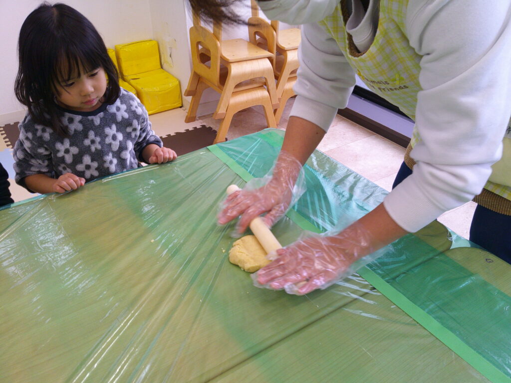 少しずつ生地をもらって、クッキーの型抜きに挑戦!!