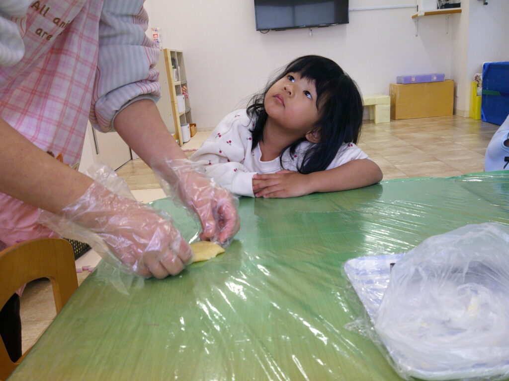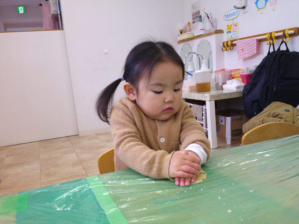 今日にじ組さんはクッキー作りを行いました。クッキーの型抜きは力が必要なので、まずは粘土で練習♬