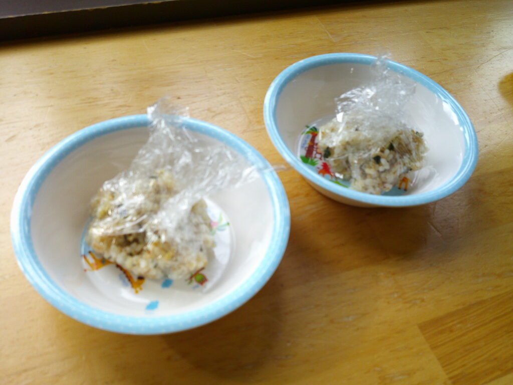 ラップでくるんだご飯を、好きな形に握っていきます。👍