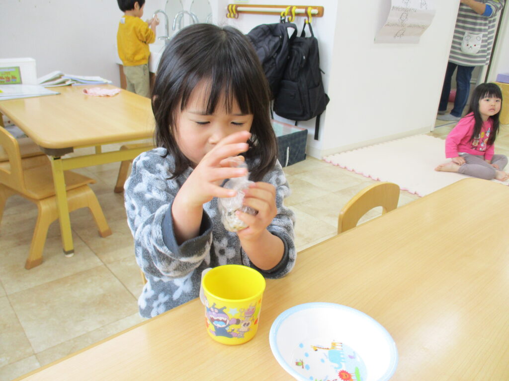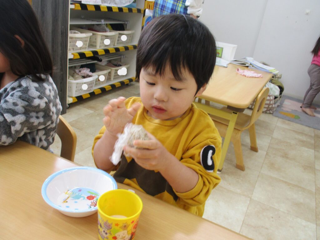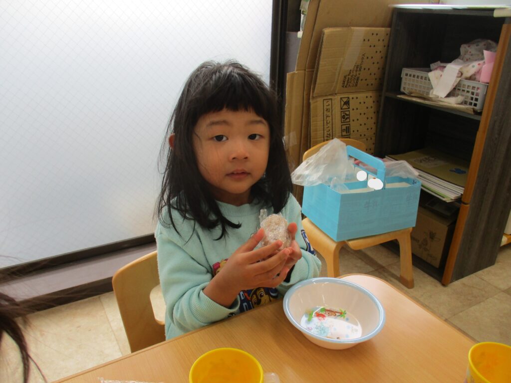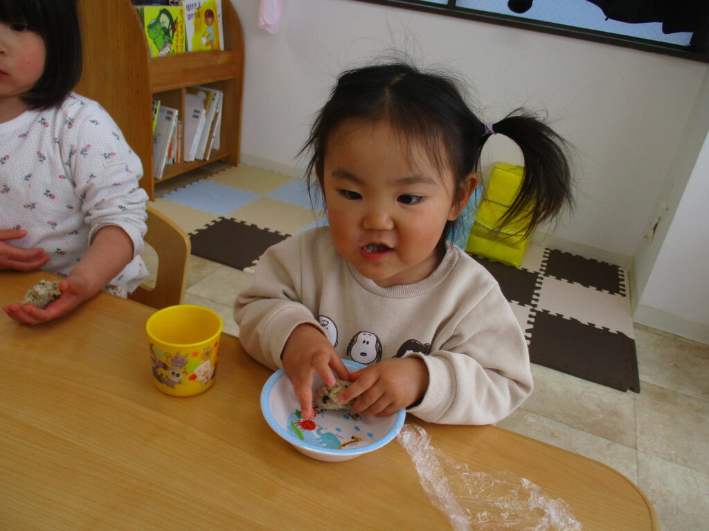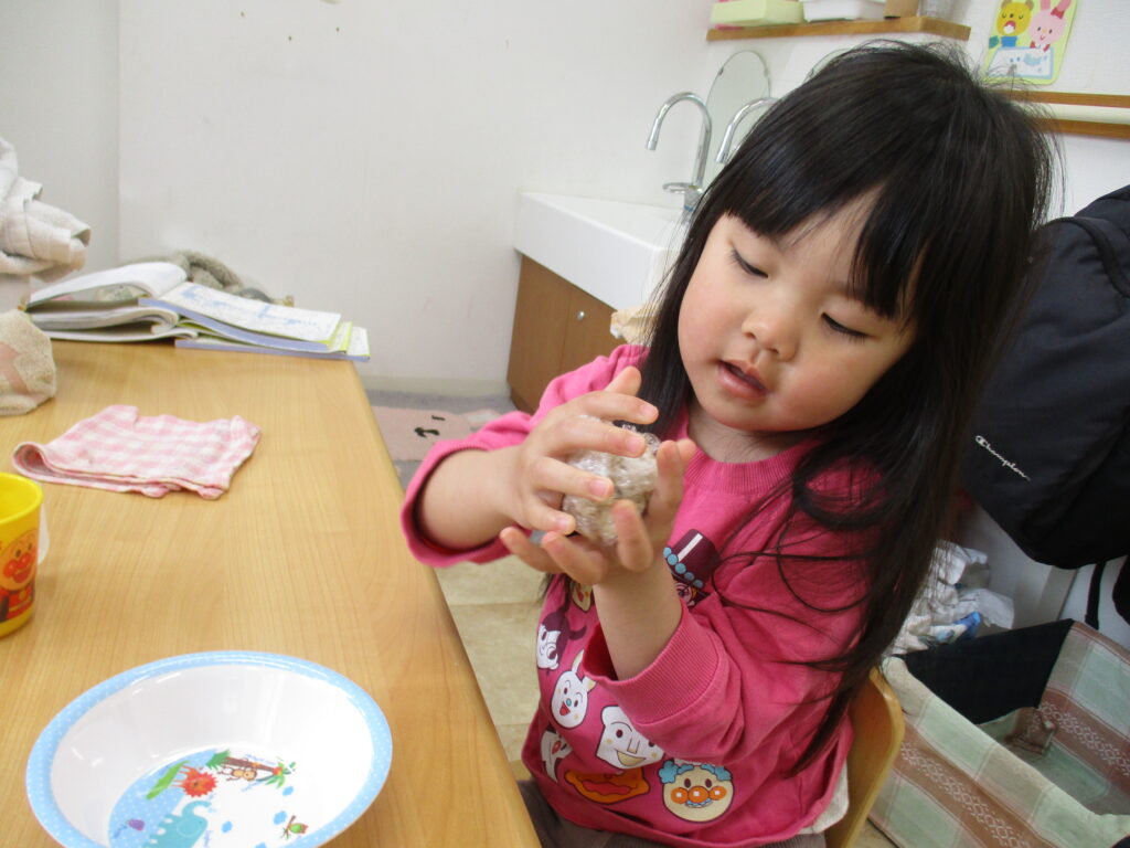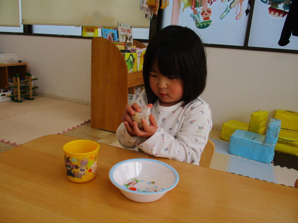 にじ🌈くみさんは、今日おやつの時間に『食育』としておにぎり🍙作りに挑戦しました。