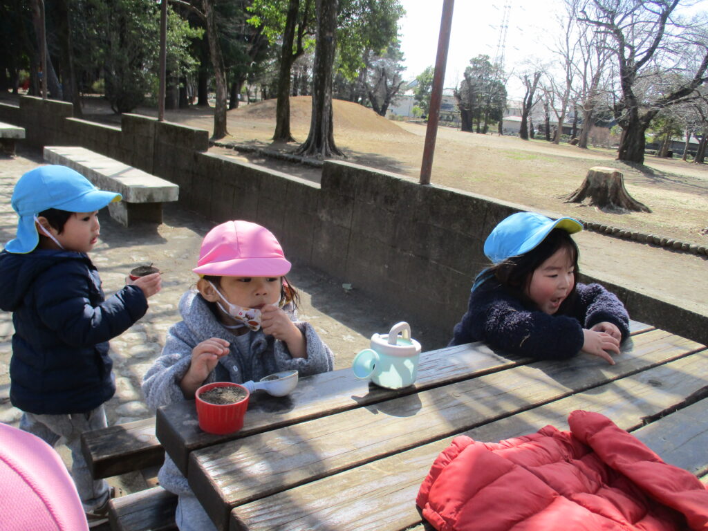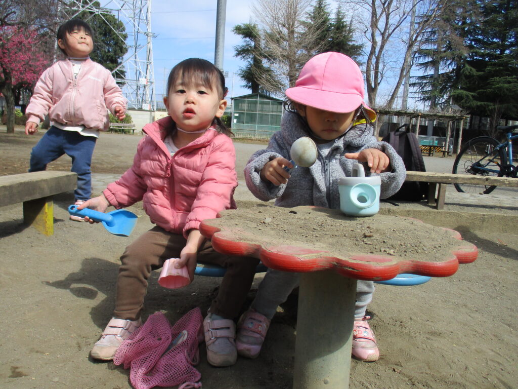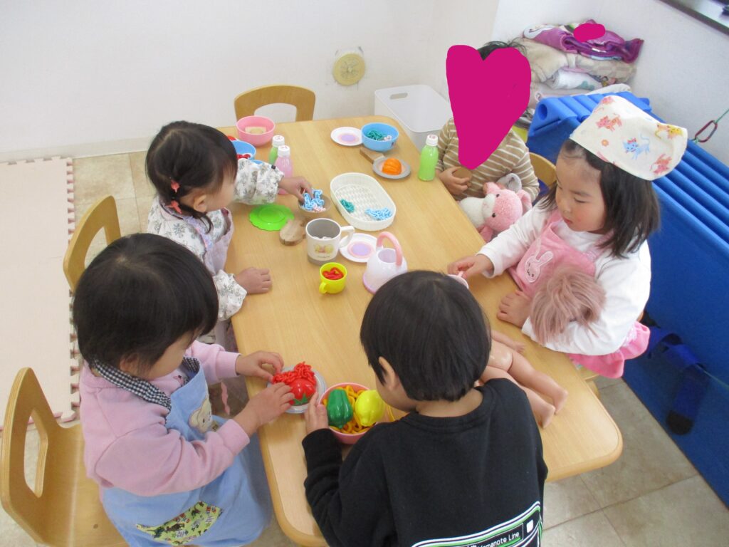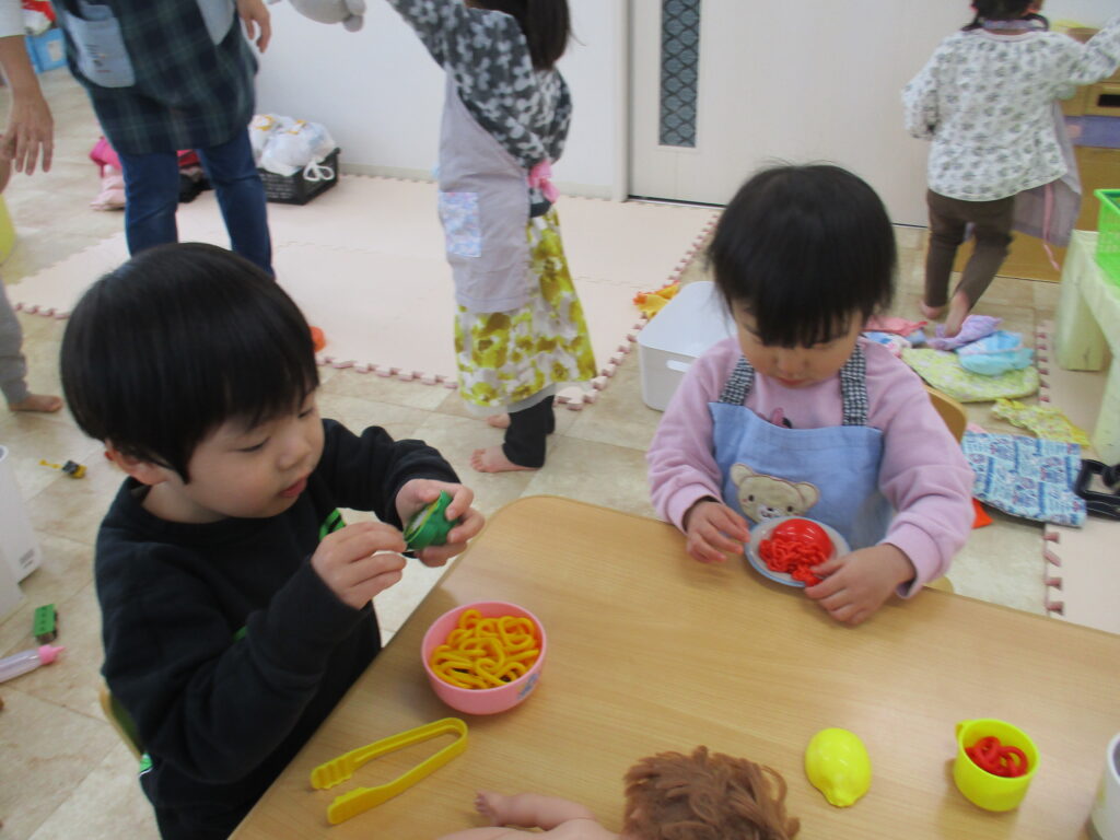 お兄さん、お姉さんの遊び方を見ると、どうやったらもっと遊びを発展させられるか・・・。遊びながら自然と身について行くようです。着替えの仕方、朝の支度の仕方、テッシュで鼻をかむ時・・・。そら組さんが、にじ組さんを見て覚えていけるのもあと少し・・・。😿